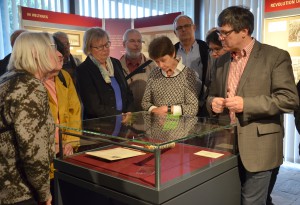 Die anschließende Führung durch die Ausstellung im Hauptstaatsarchiv würzte Dr. Ernst wie schon zuvor bei dem Rundgang mit zahlreichen Anekdoten über den im Volk sehr beliebten König, über seine Kindheit, seine Studenten- und Militärzeit, aber auch über seine beiden Ehen (seine erste Frau war über der Geburt des dritten Kindes im Alter von nur 25 Jahren gestorben) und über die in der Göttinger Studentenzeit begründeten Freundschaften. Gerade diese private Seite des Prinzen und seit 1891 Königs hat durch die Entdeckung eines umfangreichen